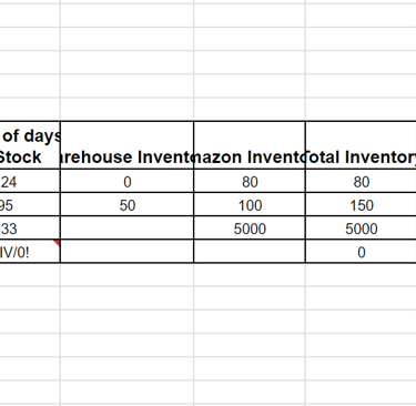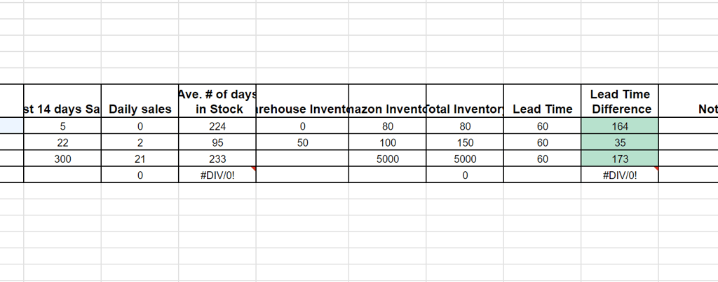 Lo que estas viendo es una tabla para gestion de inventario muy simple, pero efectiva a la hora de responder a la pregunta arriba mencionada. Por un lado, nos dice cuantos dias tenemos en los almacenes de Amazon para seguir vendiendo a la demanada basada en las ultimas dos demanas y luego nos da la diferencia de los dias que podemos vender teniendo en cuanta cuanto tiempo tardamos en volver a hacer el reestablecimiento.